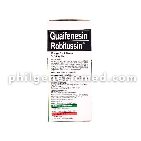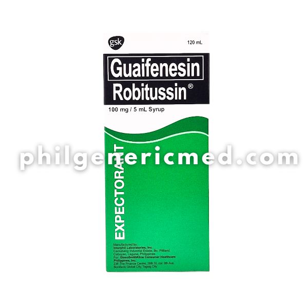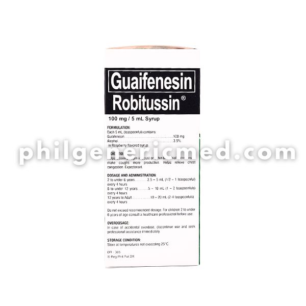 Robitussin (Guaifenesin) is an expectorant used to help loosen and thin mucus in the airways, making it easier to cough up and clear chest congestion. It provides relief from productive coughs (those with phlegm).