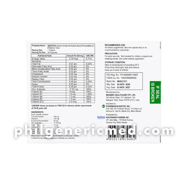 HEPATEK is a premium food supplement formulated with Carnitine Orotate, Silymarin, Essential Phospholipids, B Vitamins, and Zinc. It is designed to help support liver health, protect liver cells, and promote better metabolism.