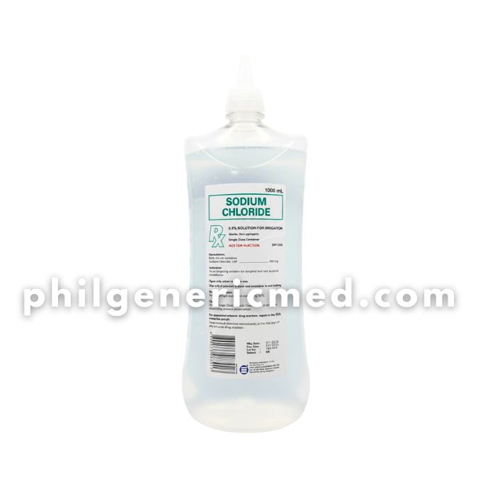 A sterile 0.9% sodium chloride (normal saline) solution in a 1‑liter bottle intended for medical irrigation. It’s a clear, sterile salt‑water solution used mainly to rinse and cleanse wounds, surgical sites, body cavities, medical instruments, and dressings.