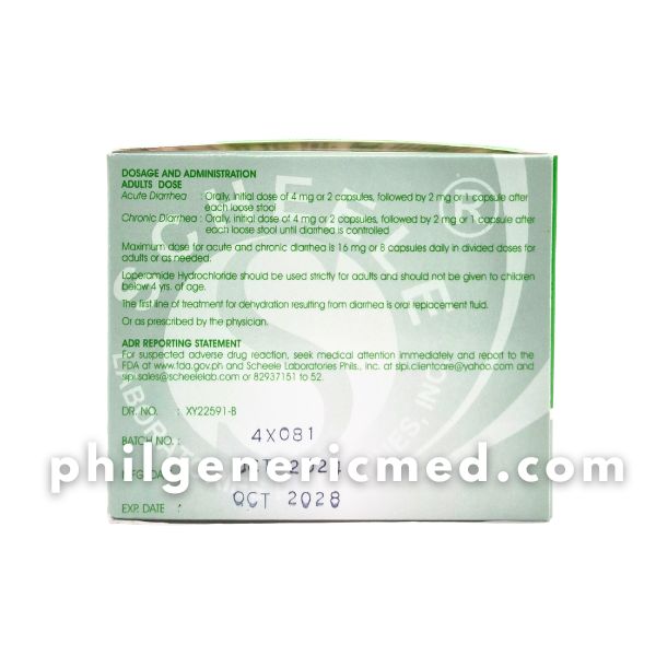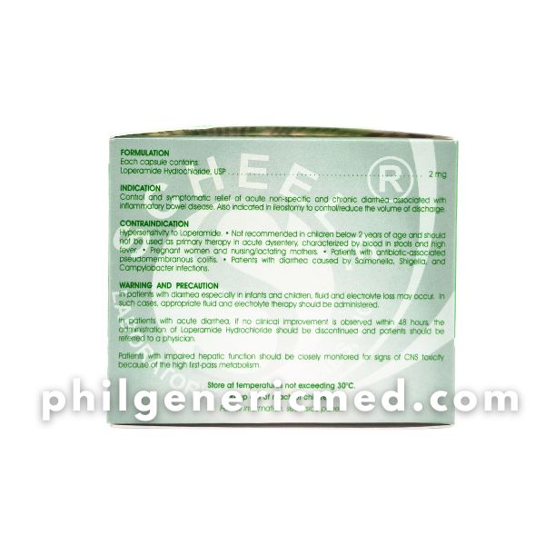 WARNING AND PRECAUTION In patients with diarrhea especially in infants and children, fluid and electrolyte loss may occur in such cases, appropriate fluid and electrolyte therapy should be administered. patients with acute diamea, if no clinical improvement is observed within 48 hours, the administration of Loperamide Hydrochloride should be discontinued and patients should be reformed to a physician. Patients with impaired hepatic function should be closely monitored for signs of CNS toxicity because of the high first-pass metabolism. Store at temperatures not exceeding 30°C.
