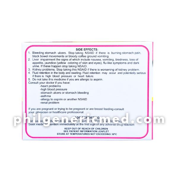 SIDE EFFECTS: 1. Bleeding stomach ulcers. Stop taking NSAID if there is burning stomach pain, black bowel movements or bloody coffee ground vomiting. 2. Liver impairment the signs of which include nausea, vomiting, tiredness, loss of appetite, jaundice (yellow coloring of skin and eyes), flu-like symptoms and dark urine. If these happen stop taking NSAID. 3. Kidney problems. Stop taking this NSAID if there is worsening of kidney problem. 4. Fluid retention in the body and swelling. Fluid retention may occur and potentially serious if there is high blood pressure or heart failure. 5. Do not take this medicine if you are allergic to aspirin. Consult your doctor if you have: -heart problems -high blood pressure -stomach ulcers or stomach bleeding -asthma -allergy to aspirin or another NSAID -renal problem If you are pregnant or trying to be pregnant or are breast feeding-consult your physician or healthcare professional.
