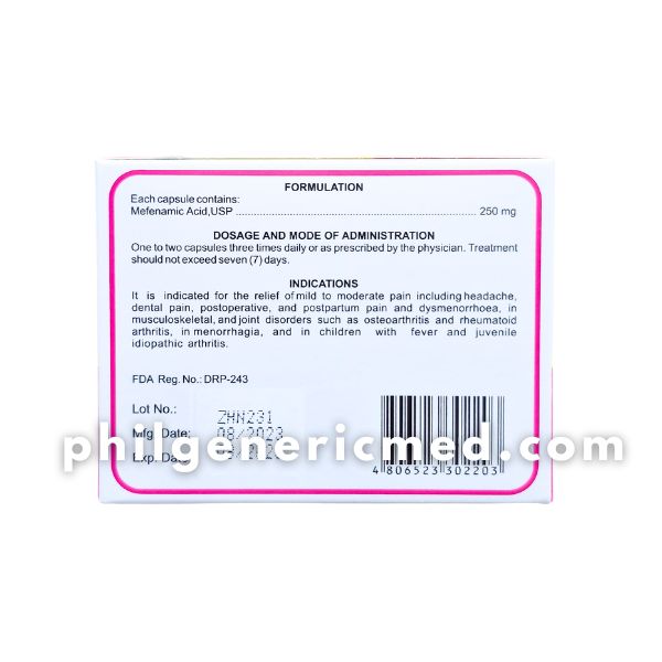 FORMULATION Each capsule contains: Mefenamic Acid, USP 250 mg