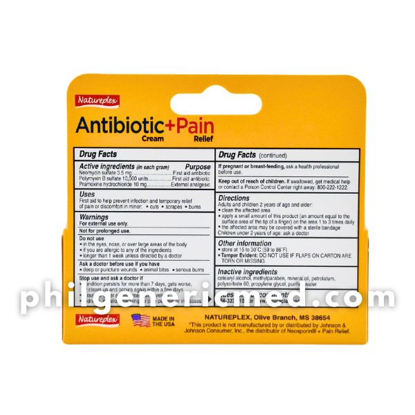 Natureplex Antibiotic + Pain Relief Cream is a topical first-aid treatment formulated to help prevent infection and relieve pain from minor skin injuries. It contains a combination of Neomycin Sulfate and Polymyxin B Sulfate, which help fight bacteria, and Pramoxine HCl, which provides temporary pain and itch relief.