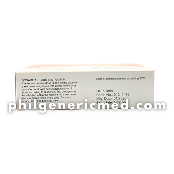 DOSAGE AND ADMINISTRATION: The recommended dose is one 10 mg capsule three times daily taken with a little fluid during and after food, with subsequent titration of dose according to response.