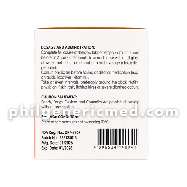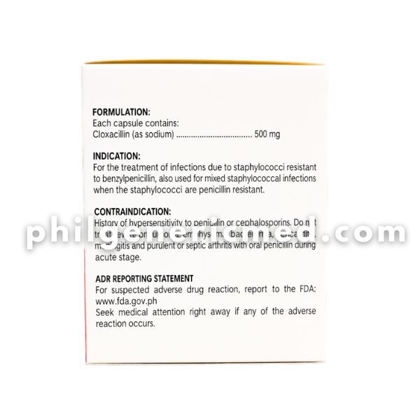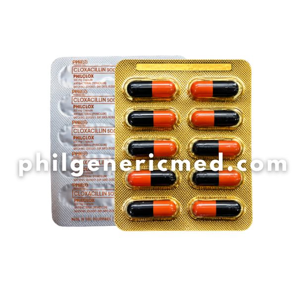 PHILCLOX contains Cloxacillin Sodium 500mg, a penicillin-type antibiotic used to treat bacterial infections caused by susceptible organisms. It works by inhibiting bacterial cell wall synthesis, effectively stopping the growth of bacteria.