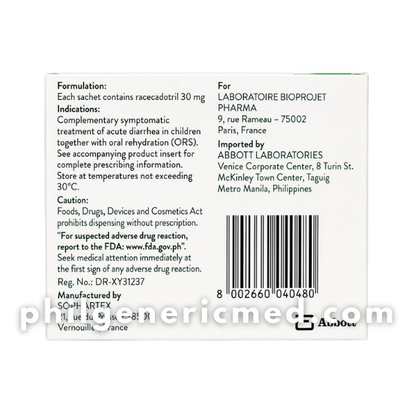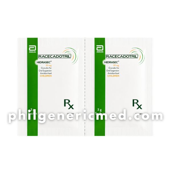 Racecadotril (Hidrasec®) 30 mg is an antidiarrheal medication formulated as granules for oral suspension, specifically for pediatric use. It works by reducing intestinal secretion without affecting normal bowel movement, helping manage acute diarrhea safely. It is commonly used alongside oral rehydration solution (ORS) to prevent dehydration and restore fluid balance.
