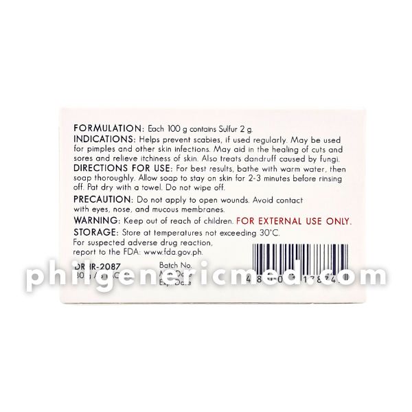 FORMULATION Each 100 g contains Sulfur 2 g : INDICATIONS: Helps prevent scabies, if used regularly. May be used for pimples and other skin infections. May aid in the healing of cuts and sores and relieve itchiness of skin. Also treats dandruff caused by fungi